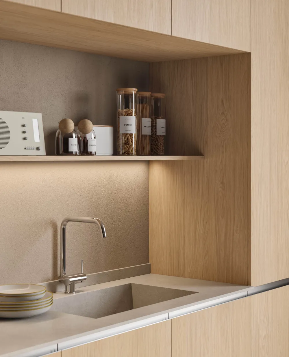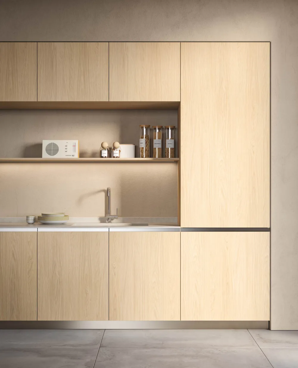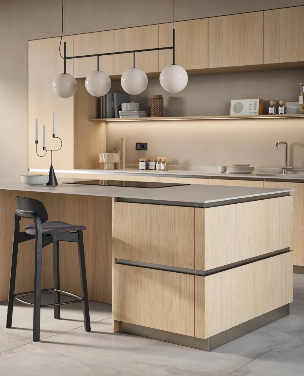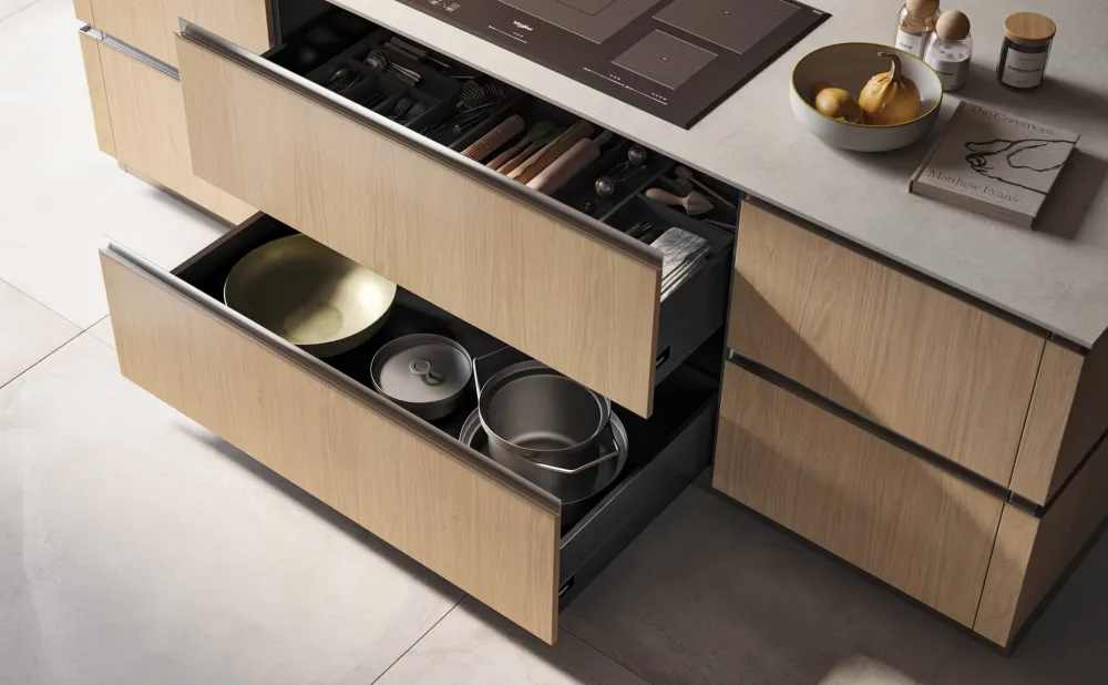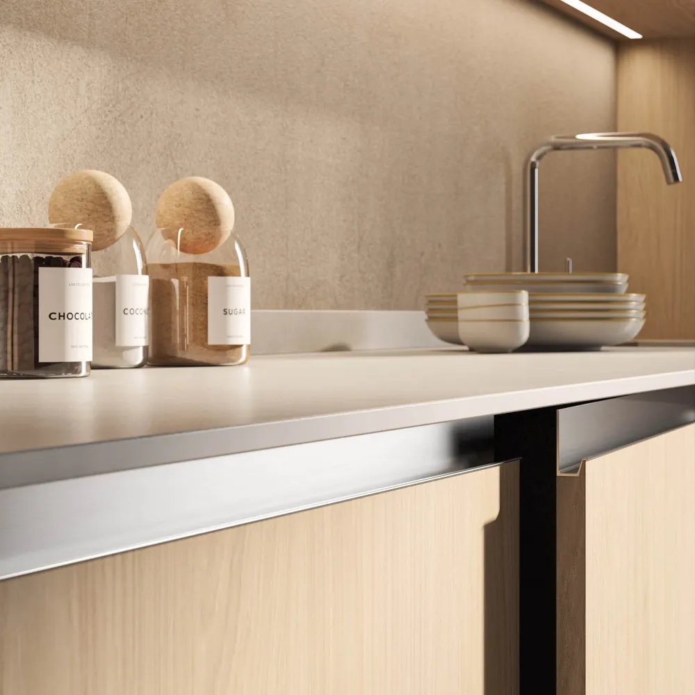 Grazie a un profilo con effetto gola sottile e funzionale, valorizza le geometrie essenziali e le linee nette della composizione. Ogni dettaglio è studiato per esprimere contemporaneità e sobrietà, offrendo una soluzione pratica e al tempo stesso elegante. L'assenza di maniglie esalta la pulizia visiva e il design armonioso, trasformando l’ambiente cucina in uno spazio moderno e ricercato.